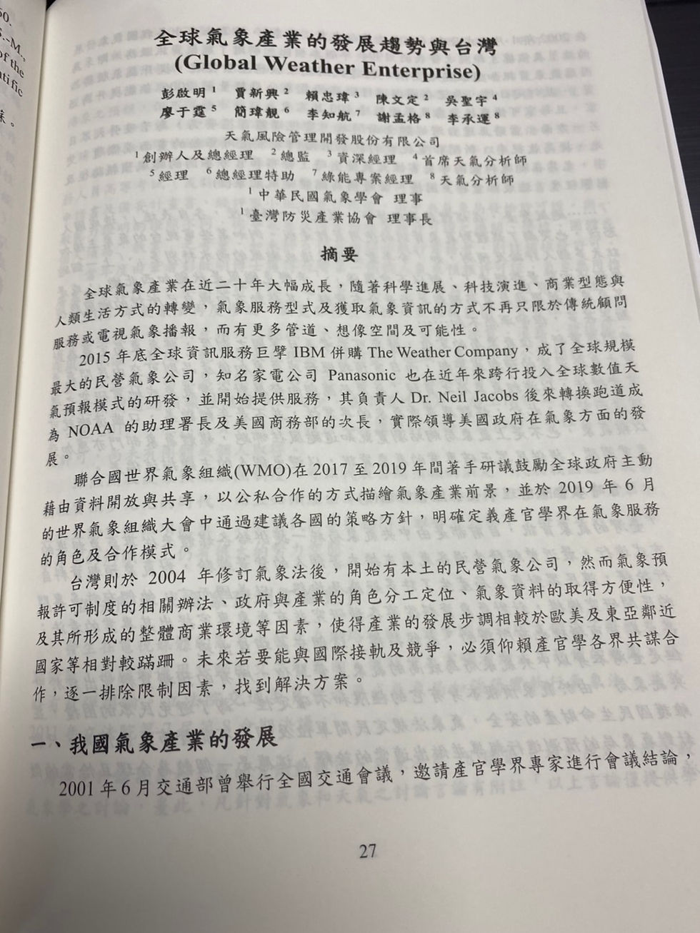 彭啟明、賈新興、賴忠瑋、陳文定、吳聖宇、廖于霆、簡瑋靚、李知航、謝孟格、李承運:,2020: 全球氣象產業的發展趨勢與台灣 (Global Weather Enterprise),中華民國氣象學會會刊,第61期,27-40。
